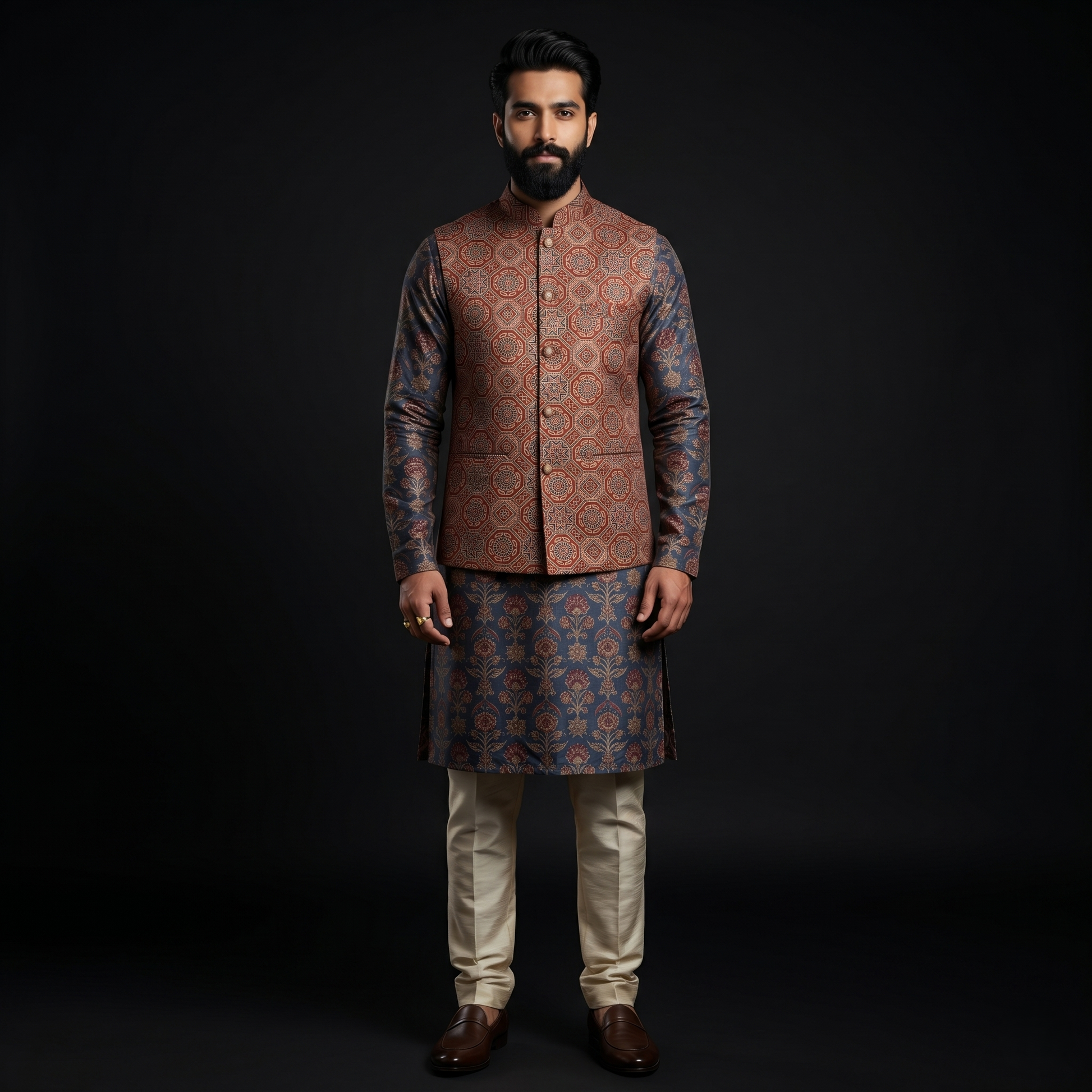 Elevate your ethnic wardrobe with this masterfully crafted men's waistcoat, showcasing a rich royal heritage aesthetic. The garment features an intricate Ajrakh-inspired geometric pattern in deep earth tones of terracotta, ochre, and charcoal, reflecting the timeless artistry of traditional hand-block printing.